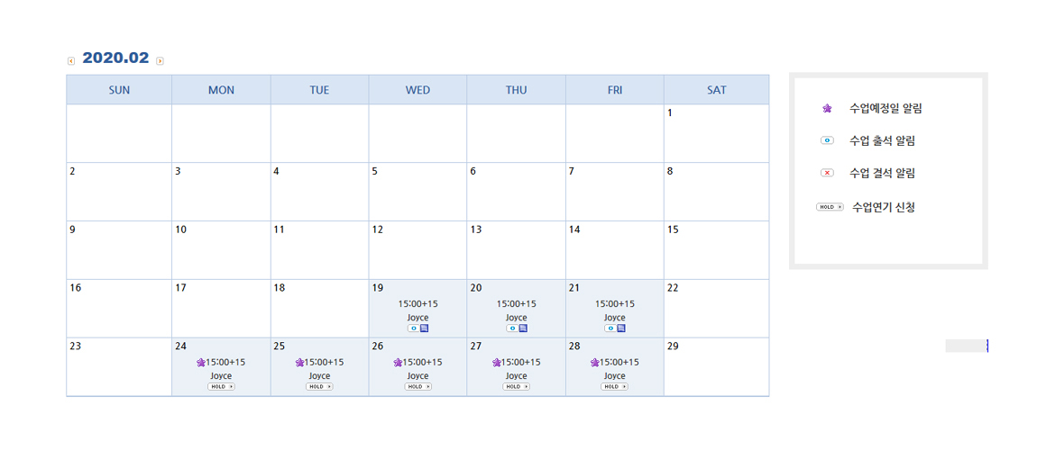 수업일, 출/결석 여부, 일일평가서를 확인할 수 있으며 또한 수업하루 전까지 수업 홀드를 신청할 수 있습니다.