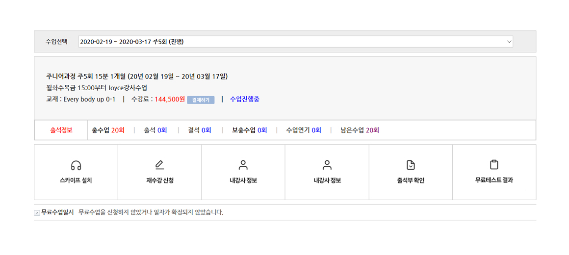 내강의실 수업요약 표시란에서 수업명, 수강기간, 무료테스트 결과, 내강사 정보, 내교재 정보등 현재 수강중인 수업에 대한 기본 정보를 확인할 수 있습니다.